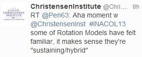Is K-12 Blended Learning Disruptive?Disruption is not a technology problem.Transistor example.Is there a market for the item at the current level of the technology? That is how transistors were introduced into hearing aids. ANd developed in parallel into electronics.How does this relate to education?Online learning has similar characteristics….As disruptive innovation developed, some tried to use it as a hybrid…Examples of this in other industries: excavator, electric cars, photography, smart phones, steam ships (started where it was essential to move against the wind, inland waterways)I think he is saying we may not choose where we will get our foothold, the foothold will offer itself up to the disruptive innovation and not the status quo.…Disrupters never invades the original…. People migrate away from the original instead.How do you spot a hybrid?