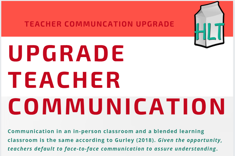 Communication in an in-person classroom and a blended learning classroom is the same according to Gurley (2018). Given the opportunity, teachers default to face-to-face communication to assure understanding. Consider when/Imagine if you had students both in-person and out on quarantine versus only virtual students. You need a teacher communication upgrade.